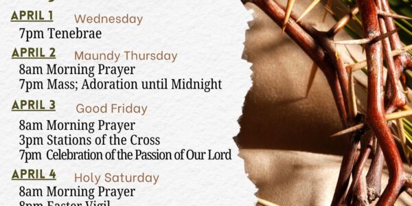 Wednesday April 1, 2026: All parishioners are invited to the celebration of Tenebrae, a service of light and shadows. This service, beginning at 7 pm, is a prayerful 30-minute prequel to the Sacred Triduum consisting of Scripture and music.