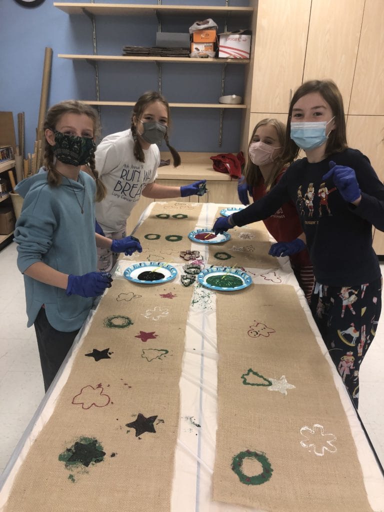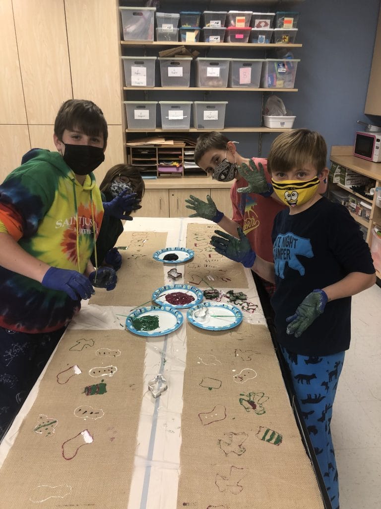 Our fifth grade enjoyed creating Christmas table runners to take home for their families. It was also Pajama Day, as you can see! For a small donation to benefit our parish shut-ins, students could wear their pajamas to school!
