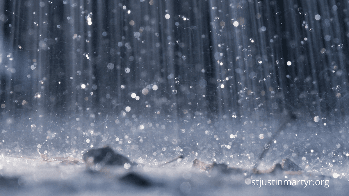 It is Sunday night, and I am looking across the parking lot to the parish center, three quarters hidden in the pouring rain coming down at a 35% angle. And I am listening to the gutters as they overflow, simply not being able to keep up at times with the torrent. Fr. Johnson has been commenting that we need rain. Well, he certainly has his wish tonight.