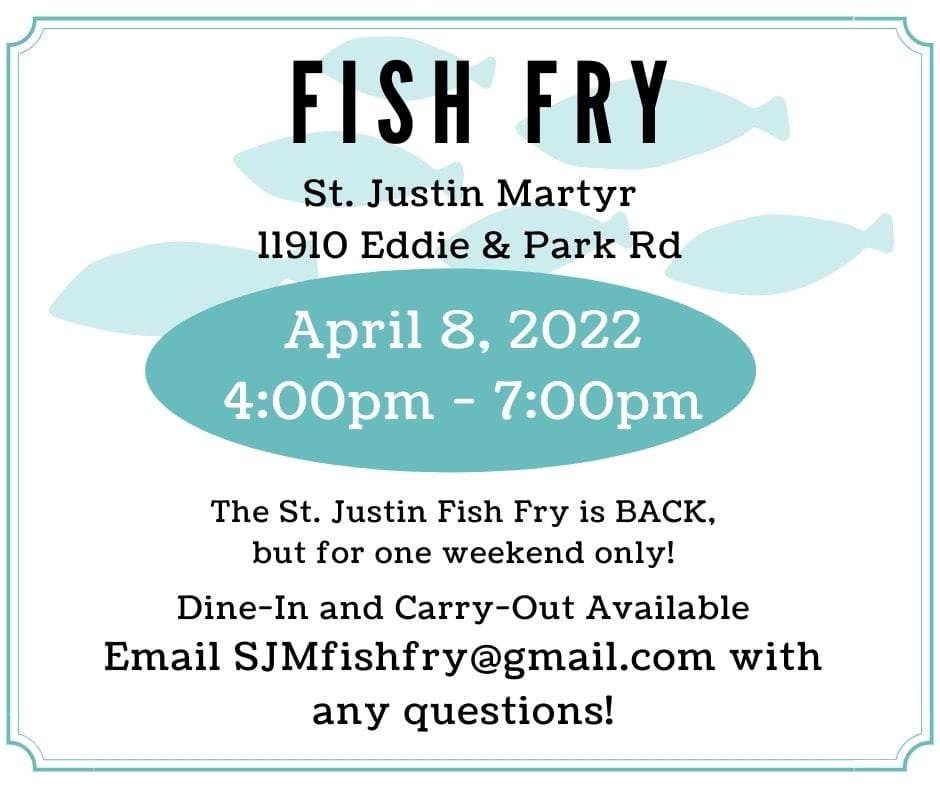 The St. Justin Fish Fry is back this year, for one weekend only! We hope you can join us for some good fish and fun fellowship on April 8, 2022 from 4:00pm – 7:00pm. There will be dine in seating in the Parish Center and a drive thru option at the side of the Parish Center, at the top of the sloped sidewalk in the upper parking lot. We can’t wait to see you