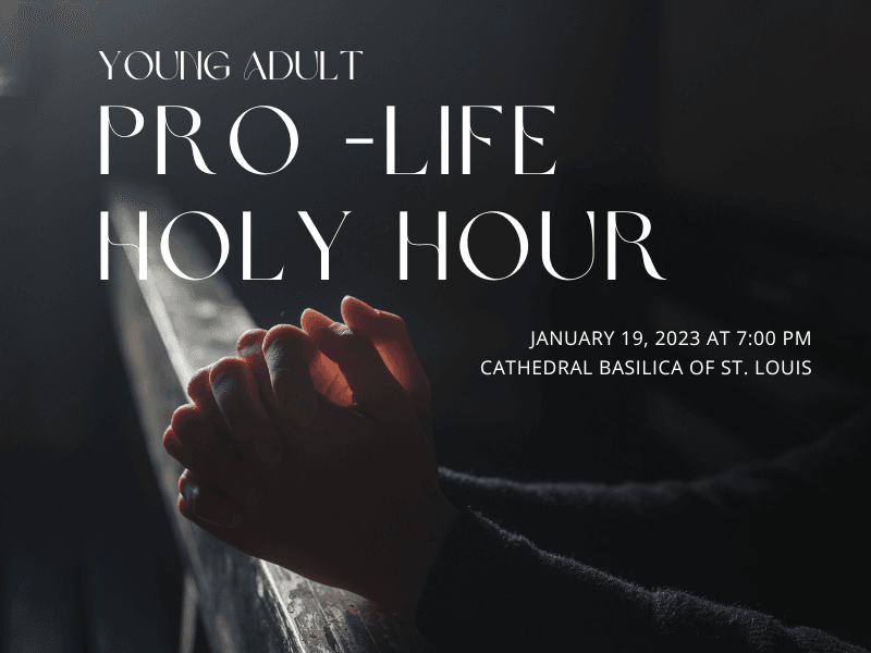 Join young adults (ages 18-39) from throughout the archdiocese to pray for an end to abortion and promote a greater respect for all human life. This annual archdiocesan event, co-sponsored by Anima Christi, the Office of Young Adult Ministry, and Respect Life Apostolate, will be held Thursday, Jan. 19, 2023, at 7 p.m. at the Cathedral Basilica of St. Louis.