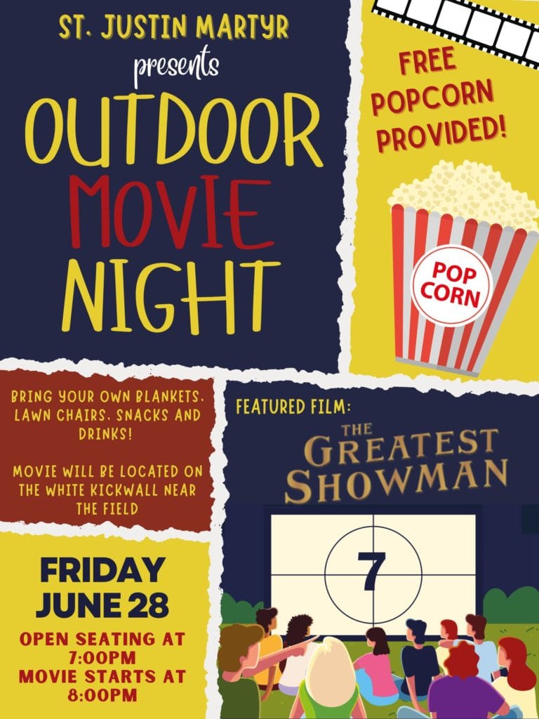 Everyone is welcome to join our Outdoor Family Movie Night on Friday, June 28th, 2024. We will be gathering by the white kick wall near the fields. Free popcorn will be served and you are welcome to bring snacks and drinks. We encourage everyone to bring their own lawn chairs and blankets to watch the show. Our feature presentation will be the Greatest Showman! Everyone is welcome to join us starting at 7pm, but the movie won’t start until 8pm (when the sun goes down). We hope to see you then!