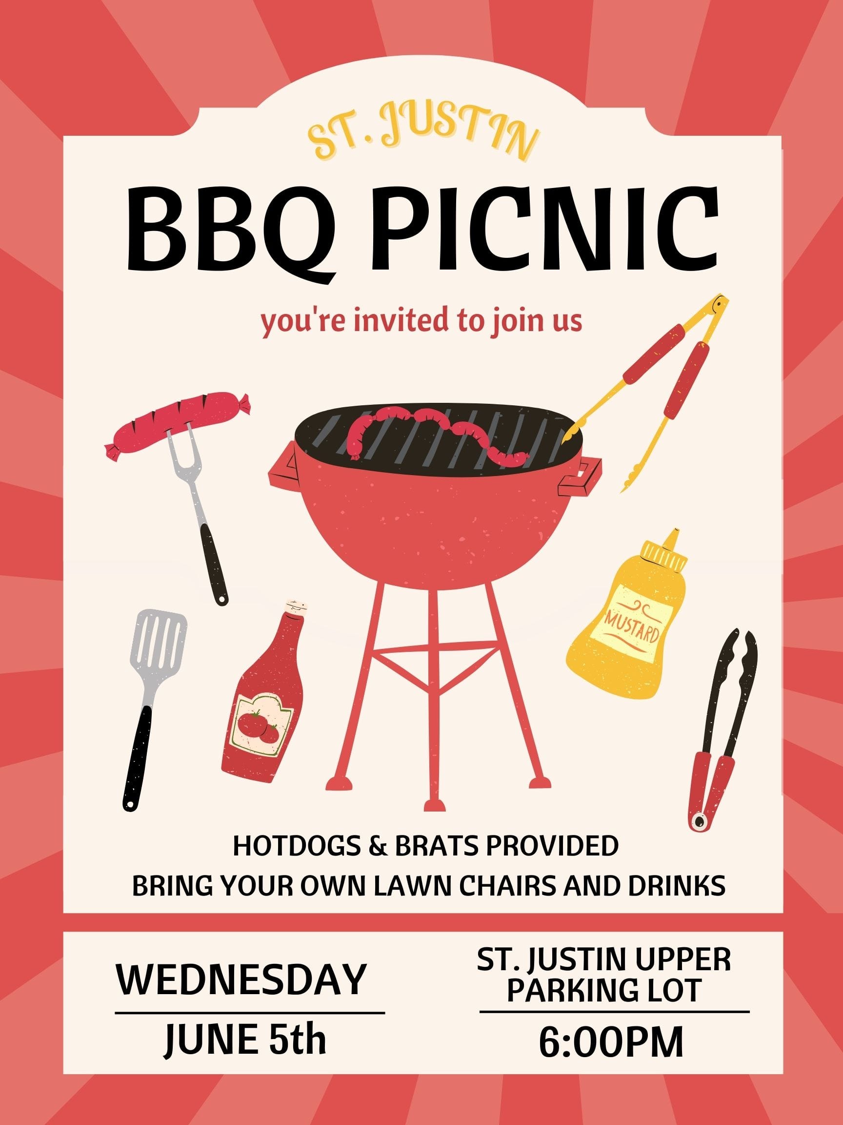 Join us Wednesday June 5th at 6:00pm for an SJM Family Picnic! We will provide hotdogs, bratwurst, chips, and popsicles. Bring your own drinks. We will meet in the upper parking lot. Some seating will be provided, but you may want to bring your own chairs. Food, games, community, & fun! Hope to see you there!