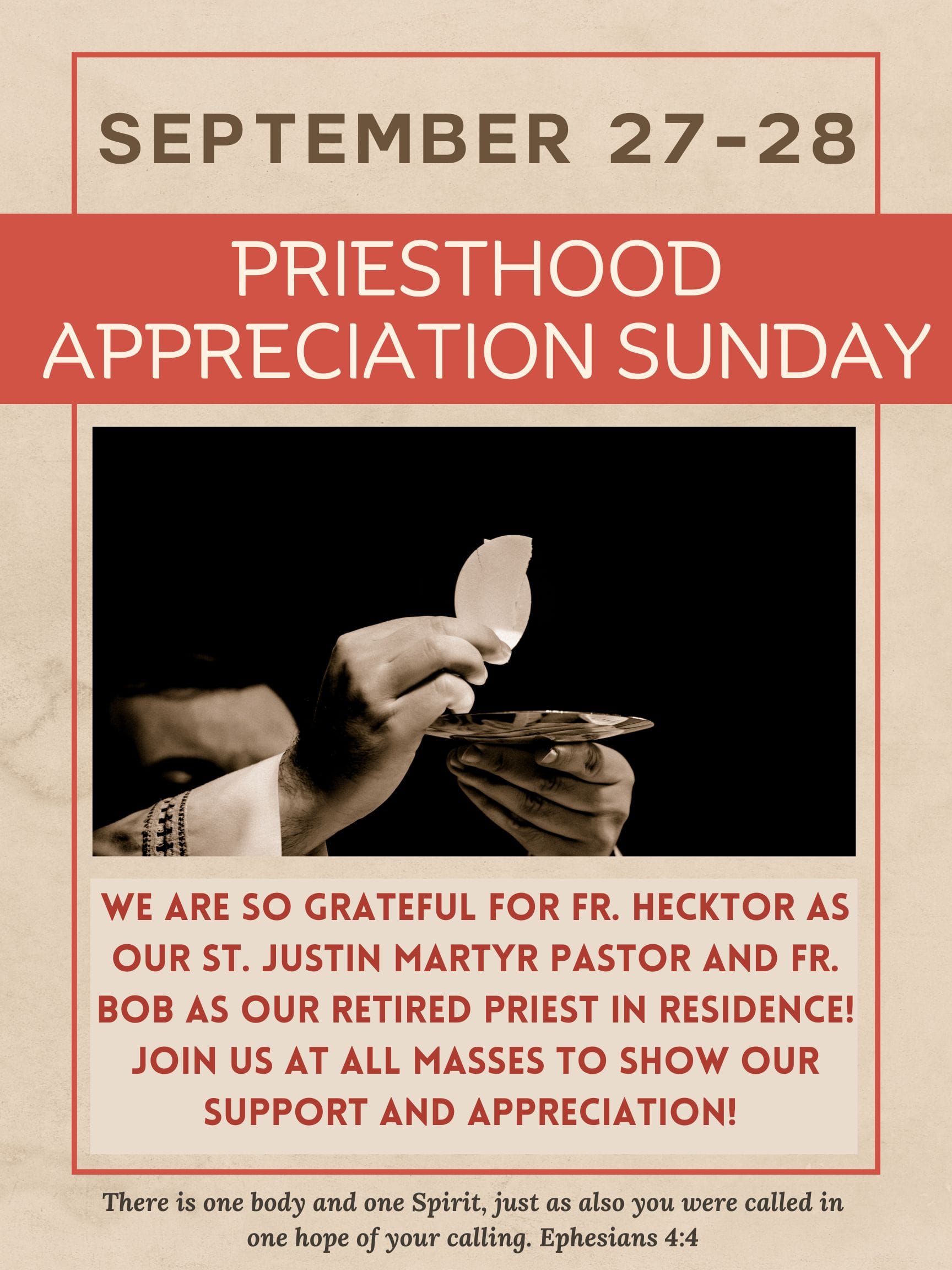 We are hosting a priesthood Sunday the weekend of September 27-28th, 2025. We are so grateful for Fr. Hecktor as our St. Justin Martyr Pastor and Fr. Bob as our retired priest in residence! Join us at all masses to show our support and appreciation! We have thank you cards in the gathering space for you to take one and bring to church on 9/27-28 and hand to our priests to show our gratitude. Call the Parish Office with any questions!