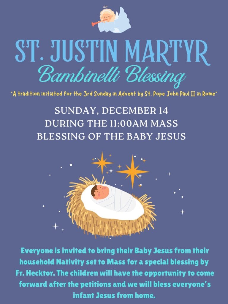 All are welcome to join us for our annual Bambinelli Blessing on the 3rd Sunday in Advent at the 11:00AM Mass on Sunday, December 14th. Everyone is invited to bring their Baby Jesus from their household Nativity set to Mass for a special blessing by Fr. Hecktor. The children will have the opportunity to come forward after the petitions and we will bless everyone’s infant Jesus from home.