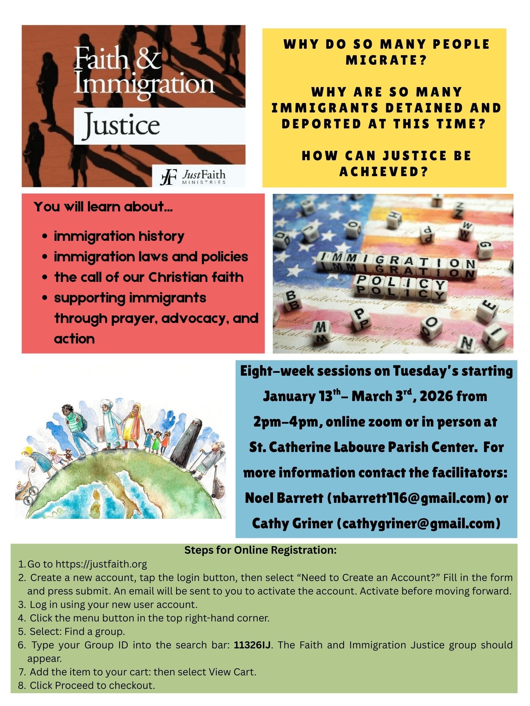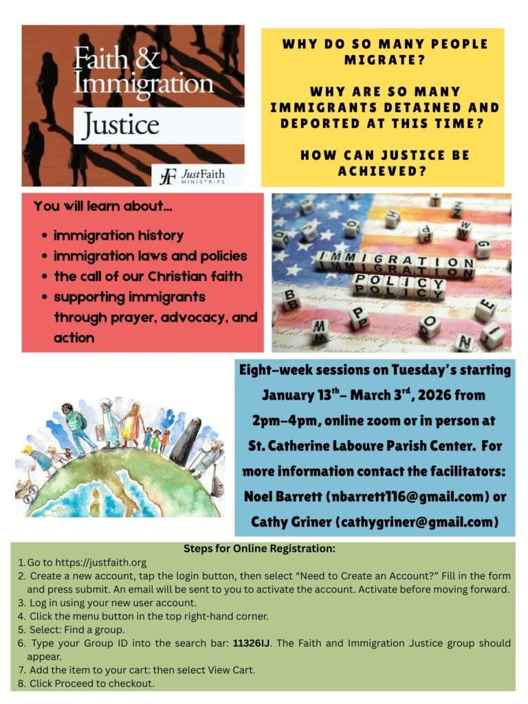 Our parish is hosting an eight-week Faith and Immigration Justice program beginning January 13 and running through March 3, 2026. Sessions take place on Tuesdays from 2 pm to 4 pm. Participants may join online through Zoom or attend in person at the St. Catherine Labouré Parish Center. This series is offered through JustFaith Ministries and provides a thoughtful look at immigration and our call as Christians to respond with compassion and action.