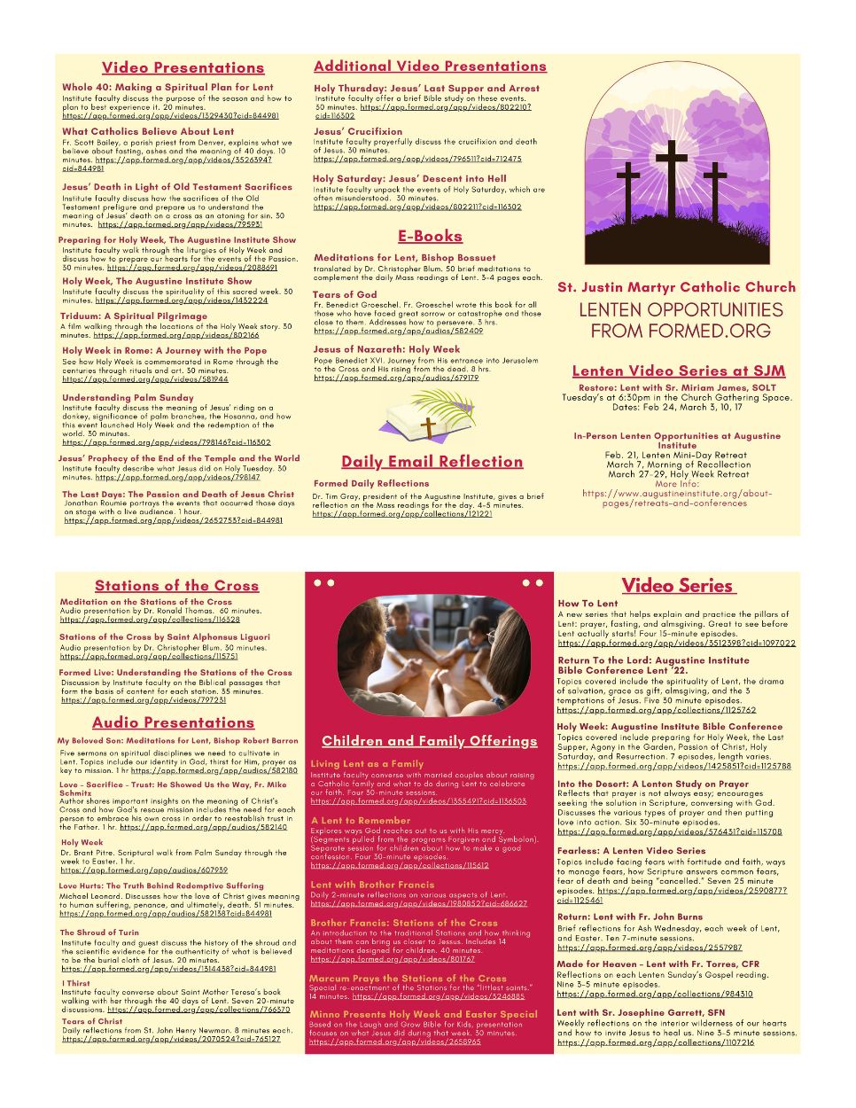 Discover Lenten videos, reflections, and family resources available through Formed, along with an in-person Lenten video series at St. Justin Martyr. These offerings are designed to support prayer and reflection throughout the season of Lent.