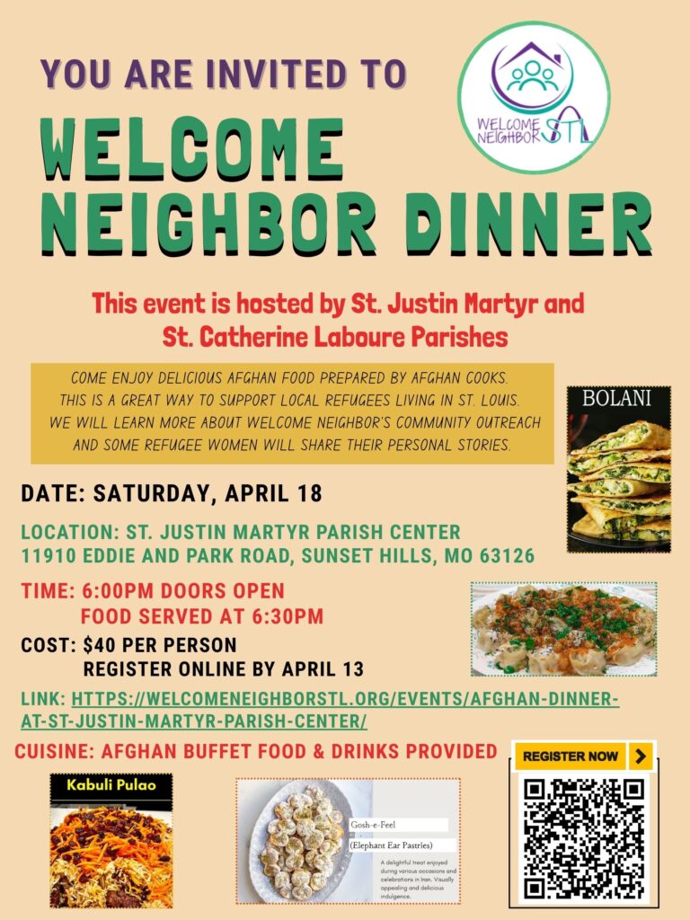 St. Justin Martyr and St. Catherine Labouré Parishes invite you to a special evening of food, fellowship, and community at the Welcome Neighbor Dinner. This event is a wonderful opportunity to gather together, enjoy a delicious meal, and learn more about the experiences of refugees living in the St. Louis area.